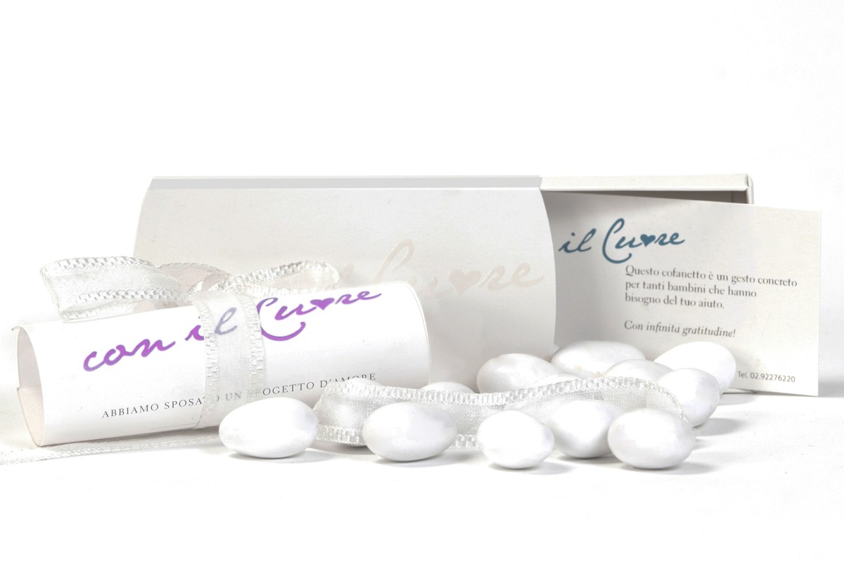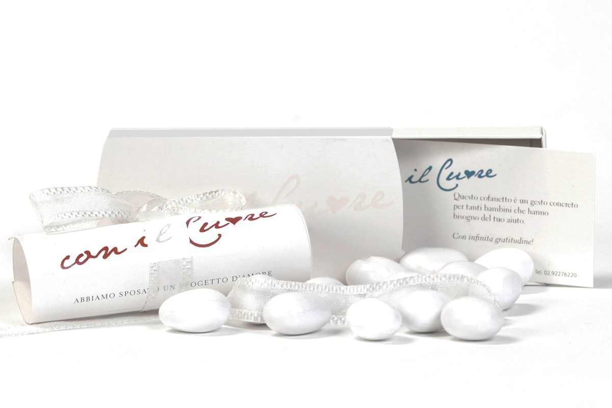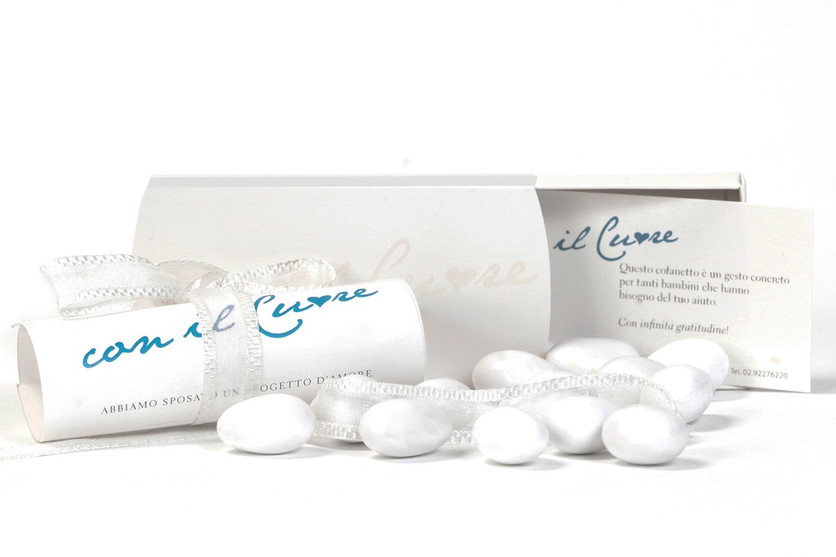 - Un cofanetto in carta Fedrigoni Free Vellum White (12,5 x 6 x 2 cm). con stampato in UV in trasparenza la scritta “Con il Cuore“;